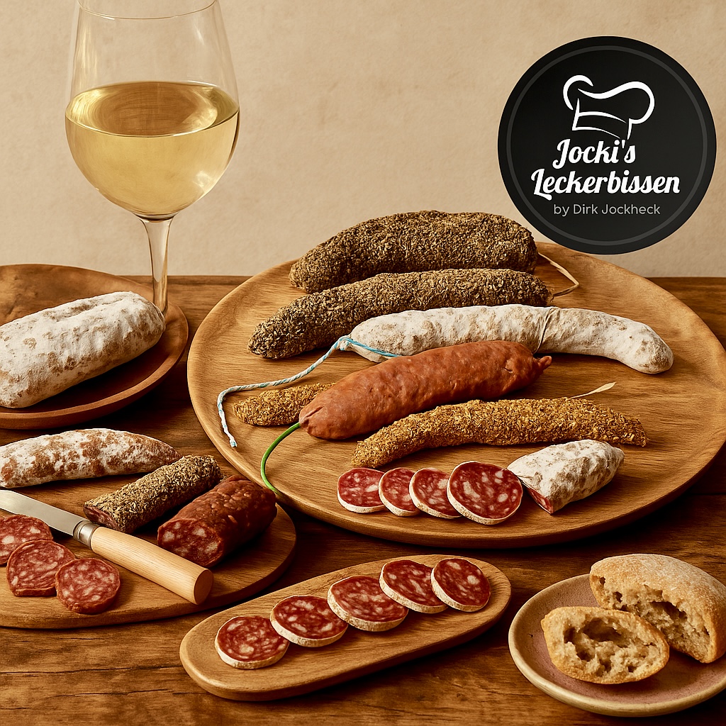 Die zart gereifte Salami entfaltet beim Anschneiden ihr vollmundiges Aroma – das Fleisch herzhaft und fein, die Feigenstücke dezent süß und saftig. Zusammen ergibt sich eine Komposition, die an mediterrane Abendstimmung und südliche Lebensfreude erinnert.
