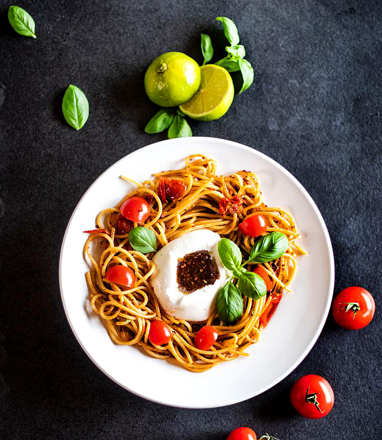 Kennt ihr schon unsere Tomaten Pesto zum Anrühren? Ganz schnell und einfach gemacht! Für eine gute Portion braucht ihr 2 TL Bio Tomaten Pesto. Mit 4 TL heißem Wasser anrühren, etwas quellen lassen und dann 4 TL Olivenöl dazugeben. Alles gut verrühren und über deine fertigen Pasta geben. Wir haben hier noch paar Cocktailtomaten angebraten und mit Basilikum und einem Burrata verfeinert. So gut wie bei deinem Lieblingsitaliener